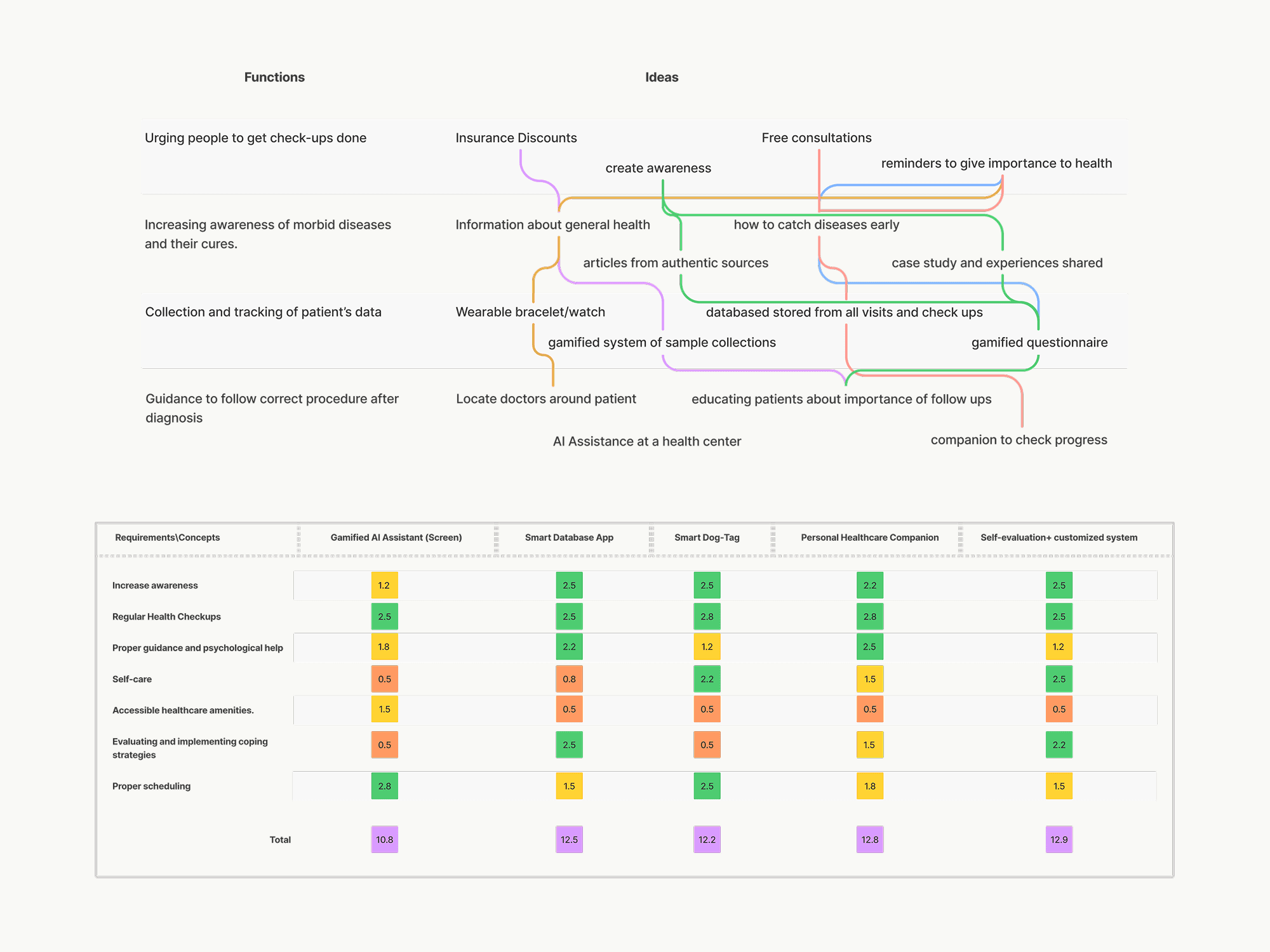 The final concept paired two touchpoints. Kshema, a friendly physical figurine that dispenses medication and connects to the clinic for data sync, and a companion mobile app that allows users to set health schedules, track goals, log nutrients, and connect with a community. A voicebot built into the system adds a layer of personalised motivation and reminders. The concept was selected through rigorous evaluation using a morphological matrix across five competing ideas, scoring highest on criteria including regular health checkups, proper guidance, and self-care.