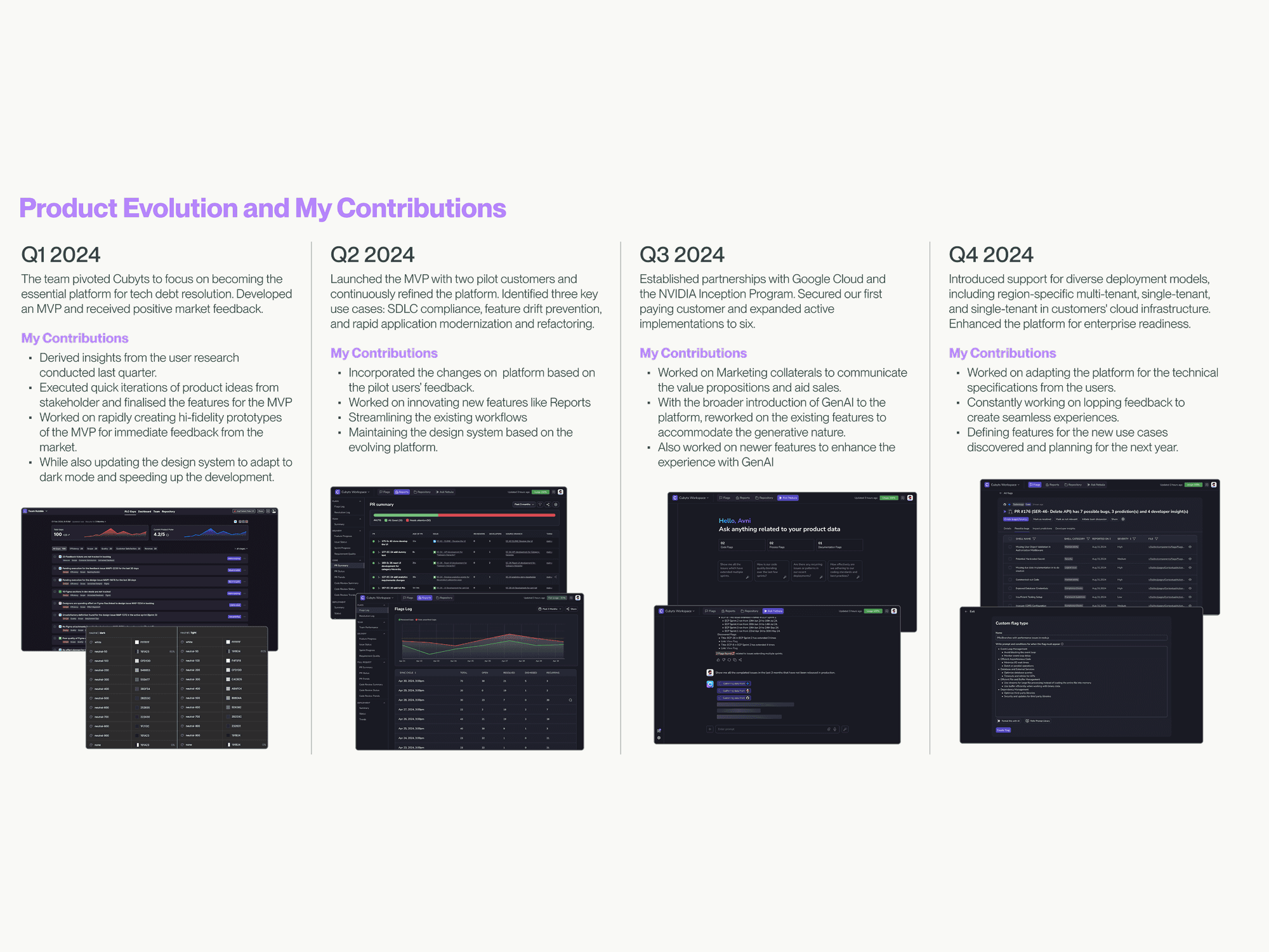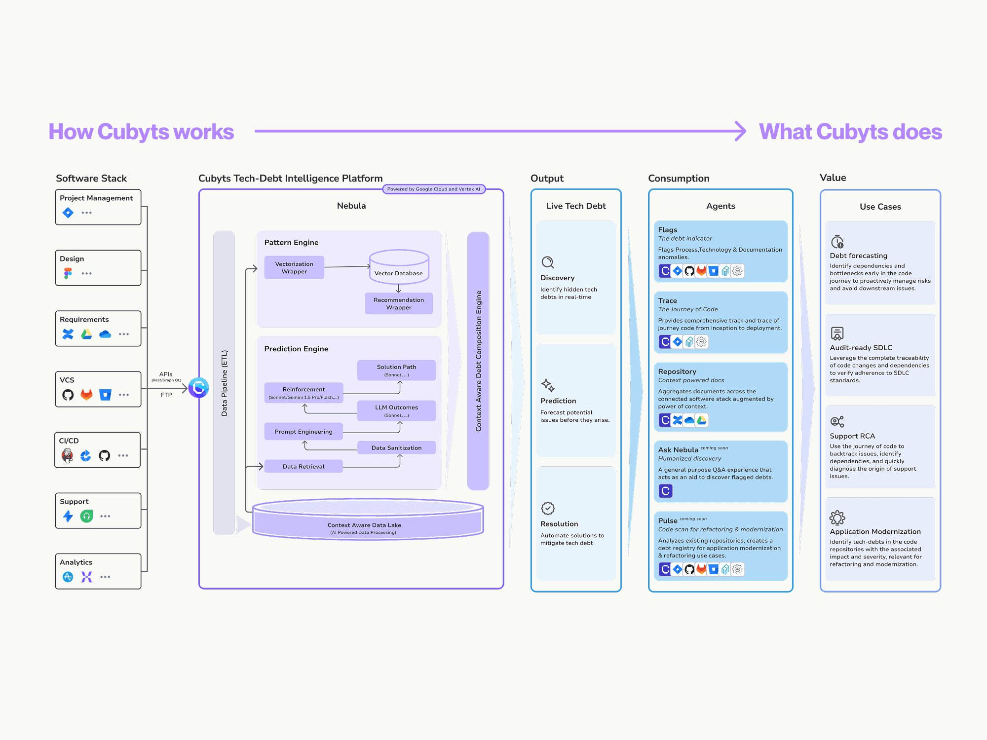 Cubyts is an AI-Driven Tech Debt Resolution Platform built to help software teams identify, predict, and resolve technical debt in real time. As the sole designer at the startup, I was responsible for all design touchpoints, from product innovation and feature definition to developer handoffs, design system maintenance, and marketing collaterals. The platform addresses three critical pain points in software development: compliance gaps, feature drift, and rework which enabled teams to ship better software, faster.